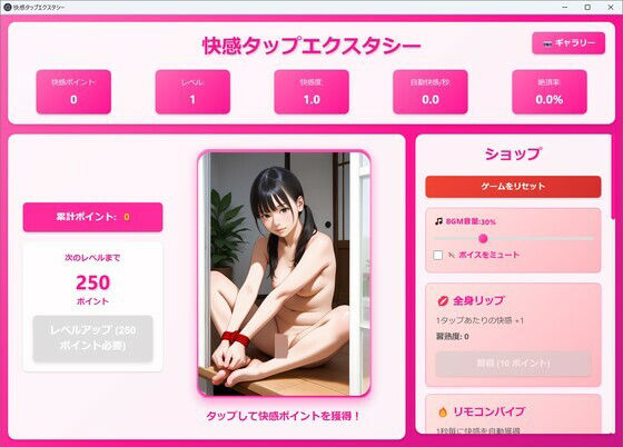 【快感タップエクスタシー】 タップするたびに快感ポイントが増える、エロティッククリッカーゲーム! ■ゲームの特徴 ・50レベルまで進化する彼女との物語 ・タップで快感ポイントを獲得し、レベルアップを目指そう ・ショップで「全身リップ」「リモコンバイブ」「指入れ」など8種類のスキルを習得可能 ・クリティカル発生時には特別なボイスが再生 ・レベルが上がるご…