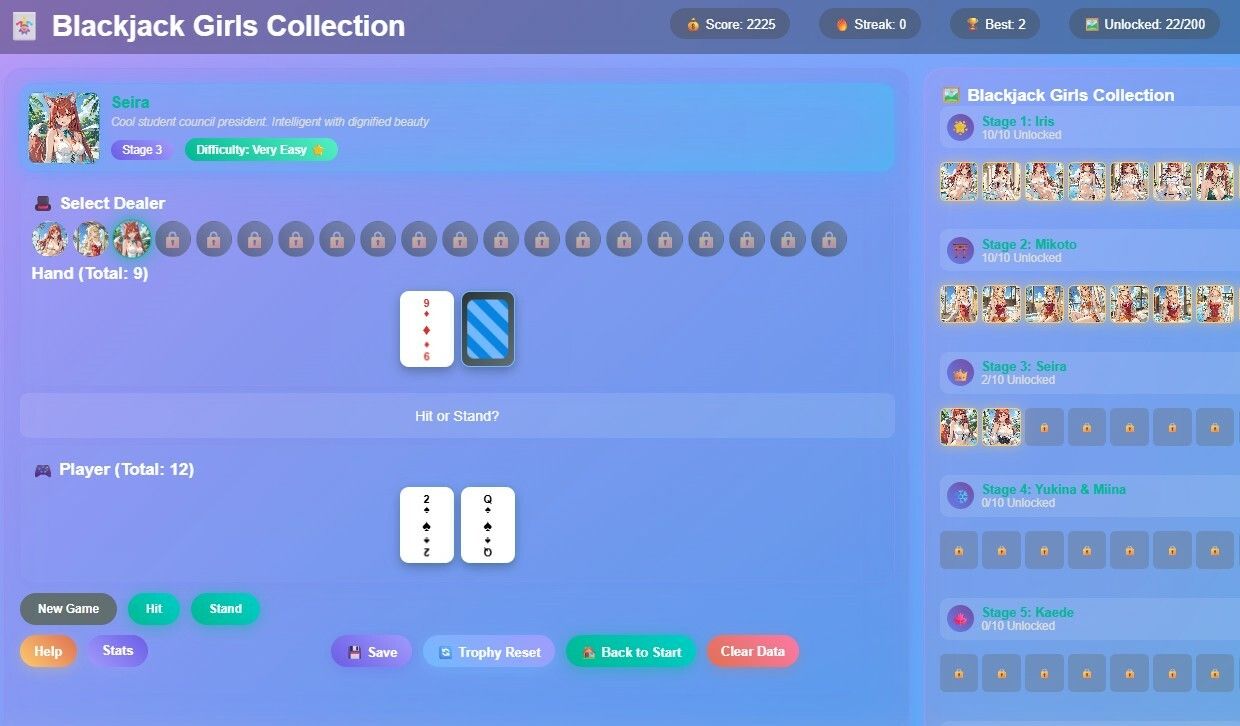 Blackjack Girls Collection is a collection-style game where you play blackjack while unlocking CG images of 20 dealer girl’s characters.